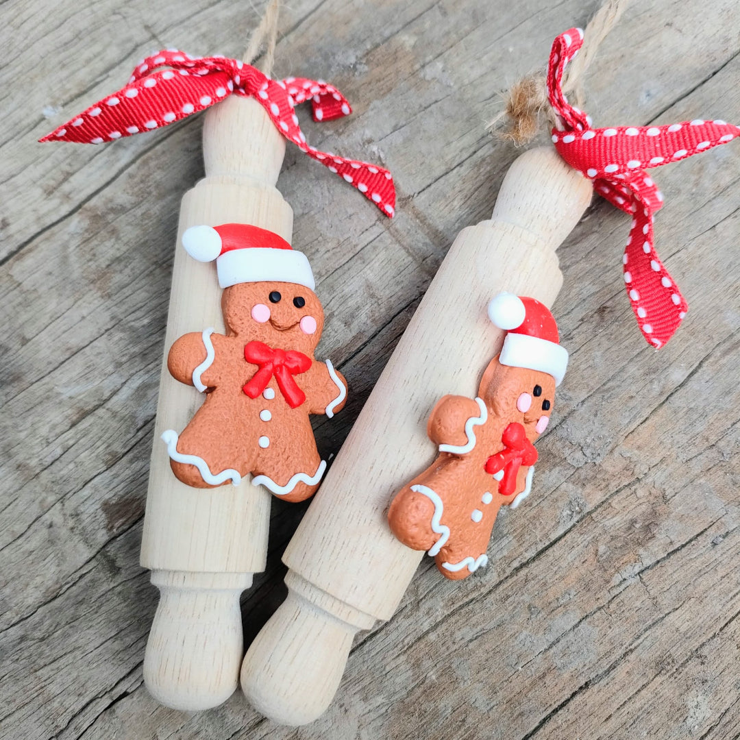 Decorazione multiuso sia appendibile che da appoggio con mattarello in legno e dettaglio di omino di marzapane natalizio.